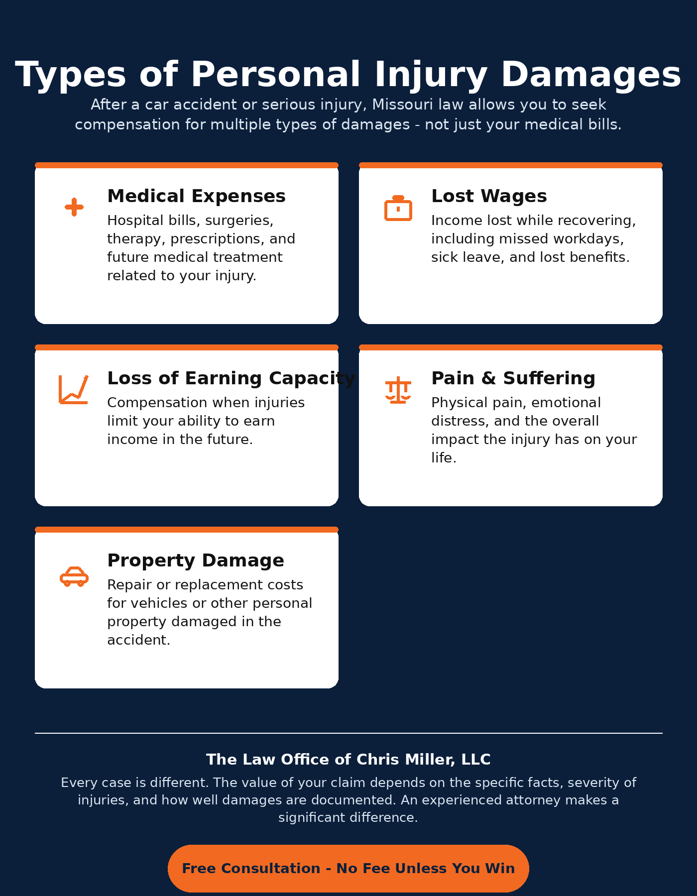At the Law Office of Chris Miller, we provide free consultations to injury victims across Columbia and Central Missouri. There is no fee unless we win your case — you have nothing to lose by calling.